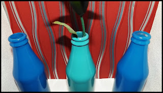 Tenía guardadas unas botellas de cristal que sabía que iba a utilizar algún día, y ese día llegó!Las pinté con spray de color turquesa y azul oscuro, les puse un poco de washi tape y listo.Con la cajita de vino ya tengo cartel y caja/leja!