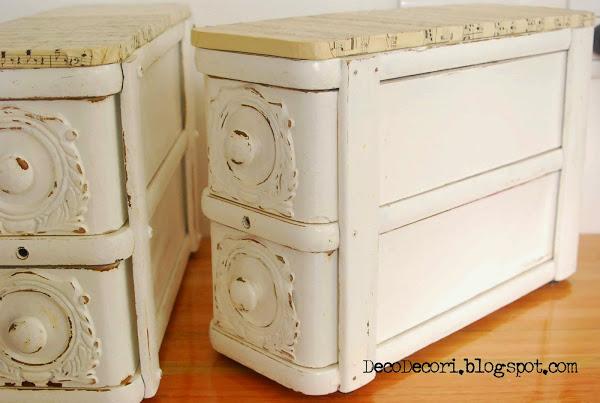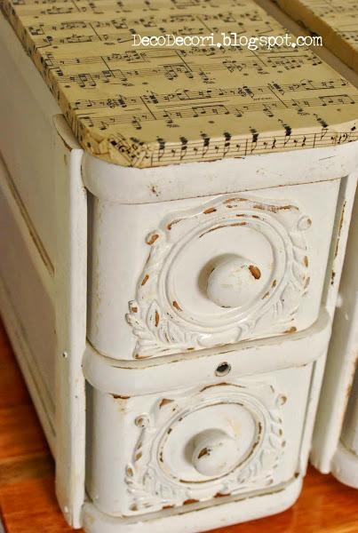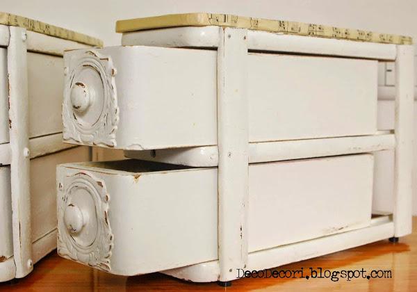 La cubierta superior está realizada con fibrofácil, forradas y protegidas con barniz acrílico al igual que los interiores de los cajones, poseen patitas de goma.