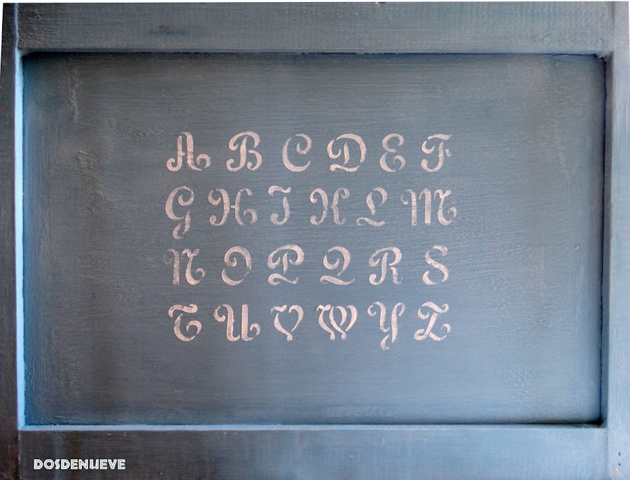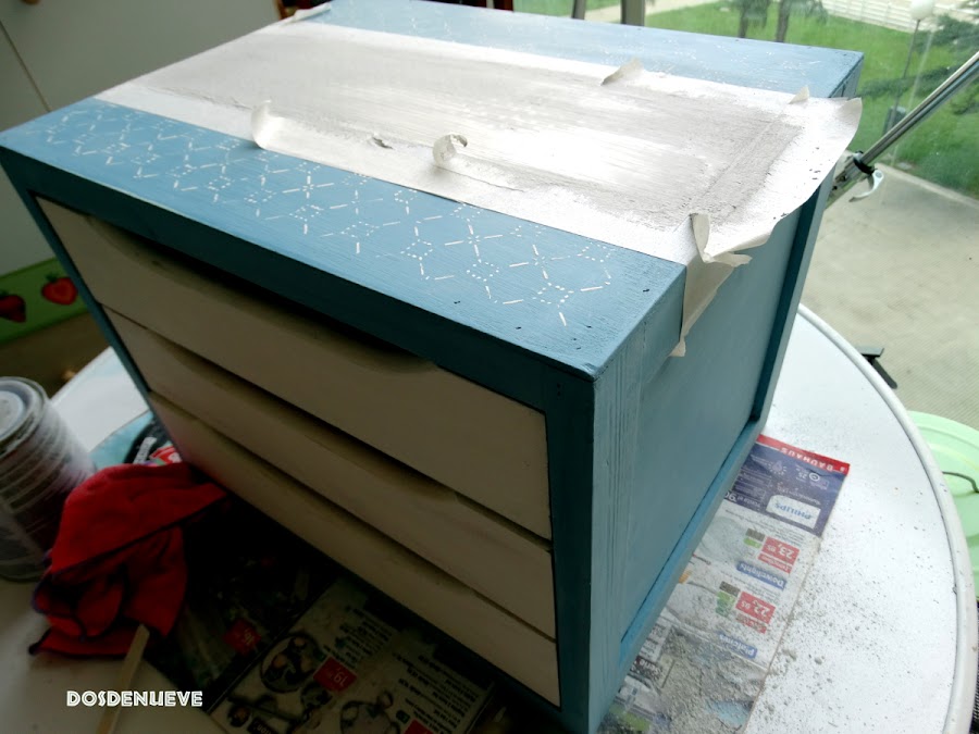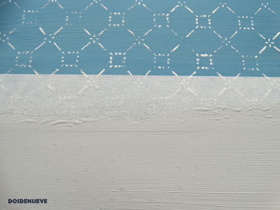 Todo el tiempo jugamos en los estarcidos con los dos tonos de pintura que hemos utilizado para pintar la cajonera.