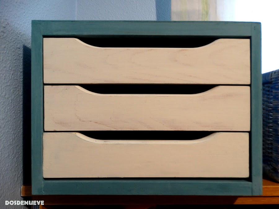 Poco a poco, vamos obteniendo alguna información para ir trabajando y que el trabajo sea "acertado". Pintamos la estructura de la cajonera con pintura a la tiza azul náutico y los cajones en blanco antiguo para que no quede demasiado oscura.