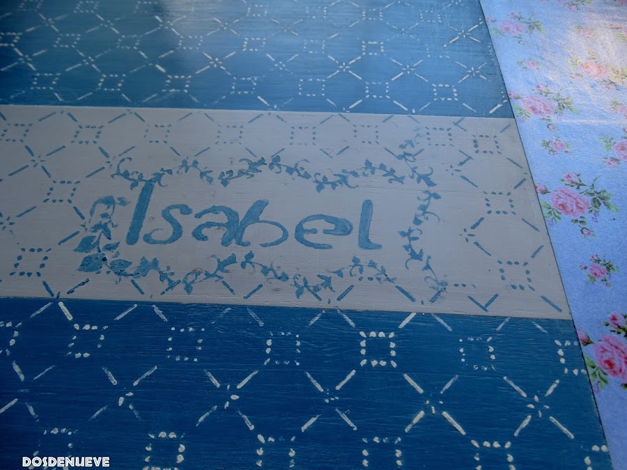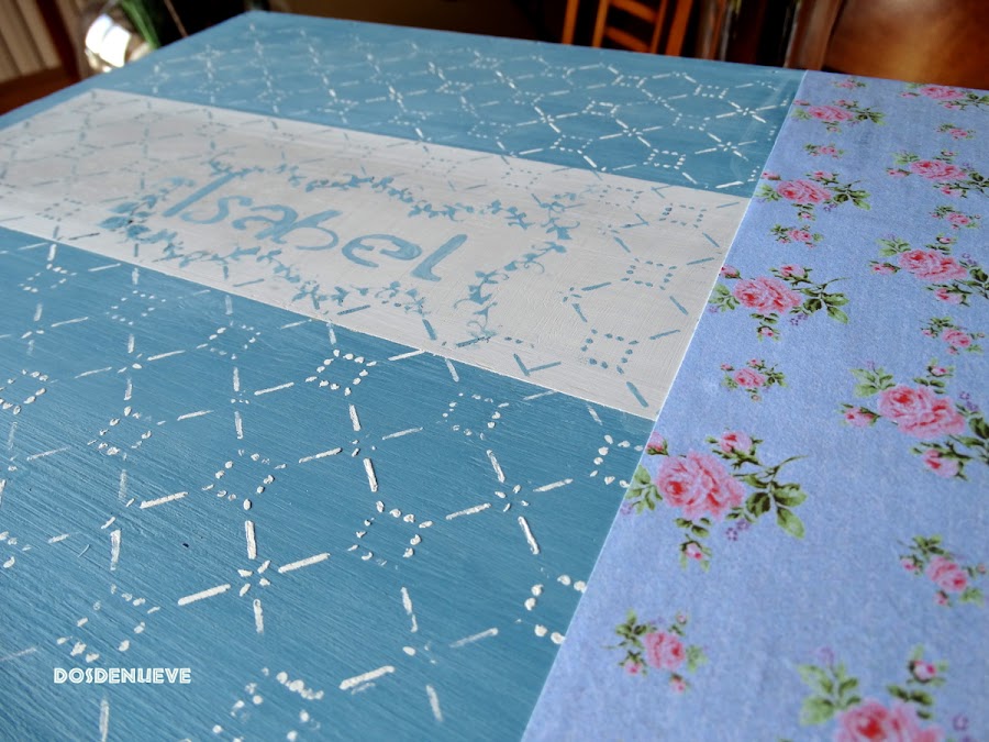 Sobre la tapa realizamos una decoración con la técnica del estarcido. La zona central, ayudándonos de la cinta de carrocero para delimitarla, la pintamos y una vez seca la pintura realizamos sobre ella otro estarcido con el nombre de la niña destinataria de la cajonera