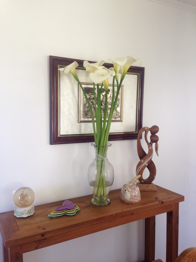No es que tenga nada contra las Calas más pequeñas y de colores (amarillas, fuccia, hasta negras). Pero yo soy de Calas blancas y grandes. Esas son las flores que amo y que llevan dos semanas adornando el comedor, la Sala y hasta la Cocina. Acá se las dejo...