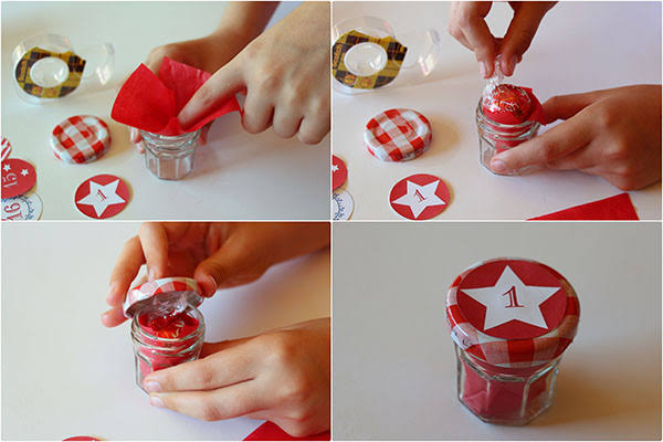 Este año he utilizado botecitos de mermelada para poner dentro la sorpresa que con tanta ilusión esperan los niños cada día.