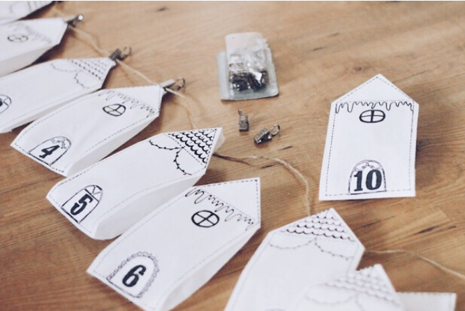 Una, que sería imprimir las casitas en folios normales, recortarlas, pegarle los números y pegar el conjunto sobre las bolsas de papel. O sea ... fácil, fácil