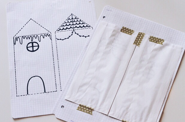 Para comprobar que la imagen de las casas van a quedar centradas en las bolsas de papel, mejor haz una prueba con un folio en blanco y así ver cómo quedarían y, en consecuencia mover las bolsas hacia los lados o hacia arriba o abajo (recuerda que la apertura de la bolsa debe coincidir con el tejado de la casa).