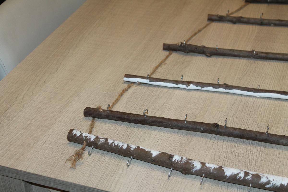 Primero se cortan las maderas (cada una más delgada que la anterior) y se hacen dos agujeros en cada palo, uno a cada extremo con el taladro. Como veis, algunas están pintadas porque mi primera idea era pintarlo de blanco, aunque luego me arrepentí y lo dejé tal como estaba. Pasé la cuerda y le hice un pequeño nudo cada vez que la pasaba para que no se moviera.