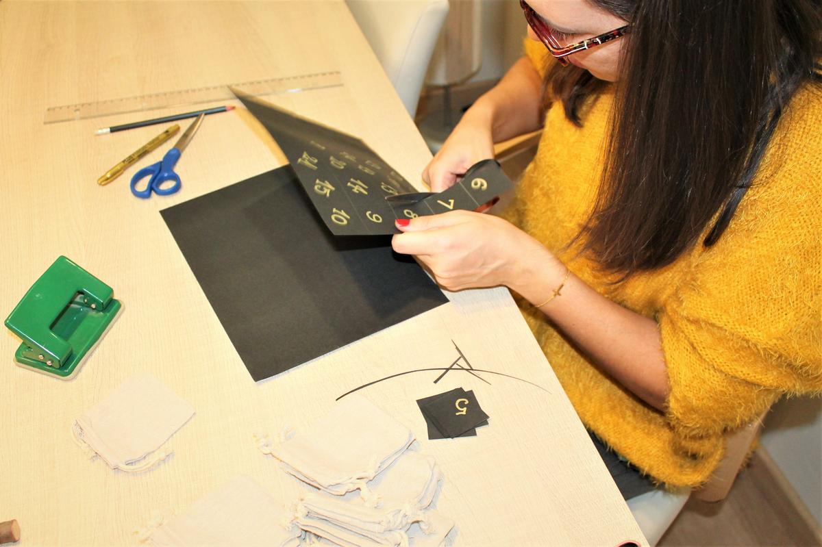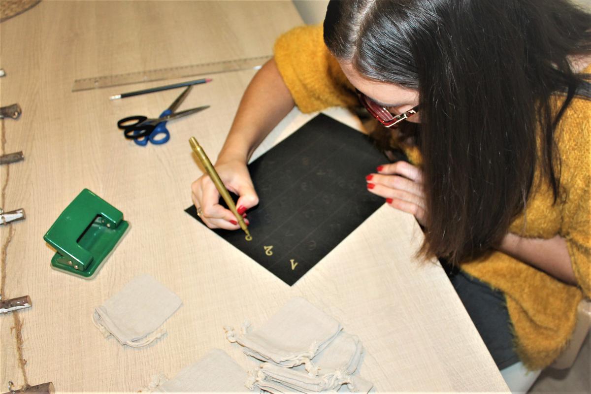 Con una regla y lápiz he dibujado pequeños cuadrados en la cartulina negra, en cada uno de los cuadrados he dibujado con el rotulador dorado los números