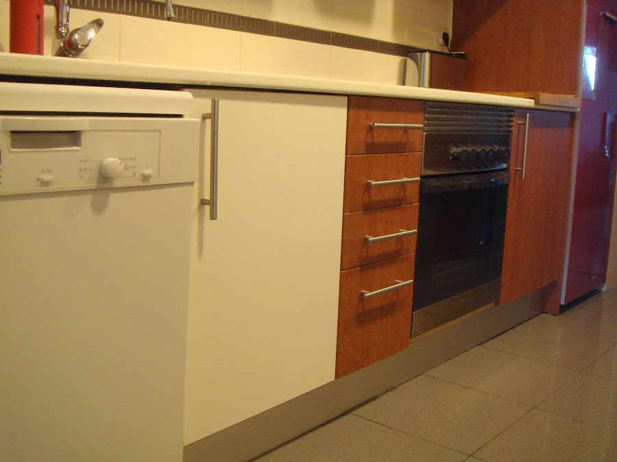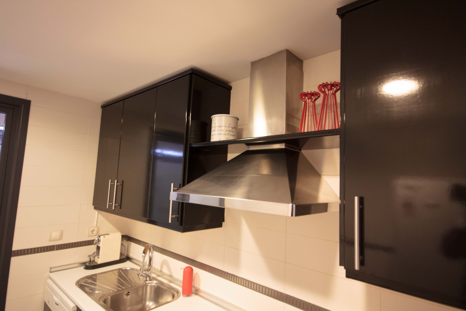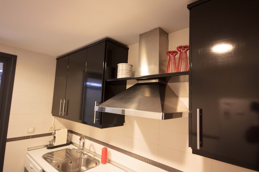 Una de las cosas que menos me gustaba de la cocina, y que sabía que tenía fácil solución, era la combinación de colores. Por eso me decidí a panelar los muebles con vinilo. El color que escogí fue el negro: siempre me han gustado las cocinas con este color, y como he mencionado antes, es un color que ya existía en la cocina... Es un color atemporal, moderno y además al ser vinilo y no pintado, tiene brillo, por lo que refleja la luz... era perfecto. Uno de los paneles verticales, que era de madera color cerezo, lo he puesto con vinilo blanco, para que contrasten ambos colores.