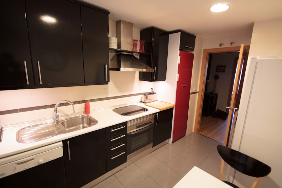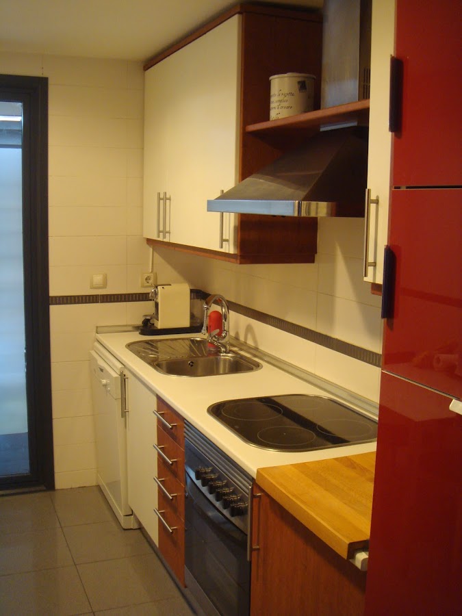 Se trata de una cocina con un único frente de trabajo, no muy grande como podéis ver. La nevera se encuentra a la espalda del fuego porque quisimos una nevera americana (porque era importante que hiciera hielo). El hueco que estaba planeado para la nevera lo ocupamos como un mueble de cocina de IKEA, el rojo que se ve en las fotos. Se combinan la madera con el blanco, pero en la cocina hay mucho gris/negro: el suelo, la franja del alicatado, la carpintería de la casa es gris antracita, la vitrocerámica, el horno... eran demasiados colores para ese espacio tan reducido...