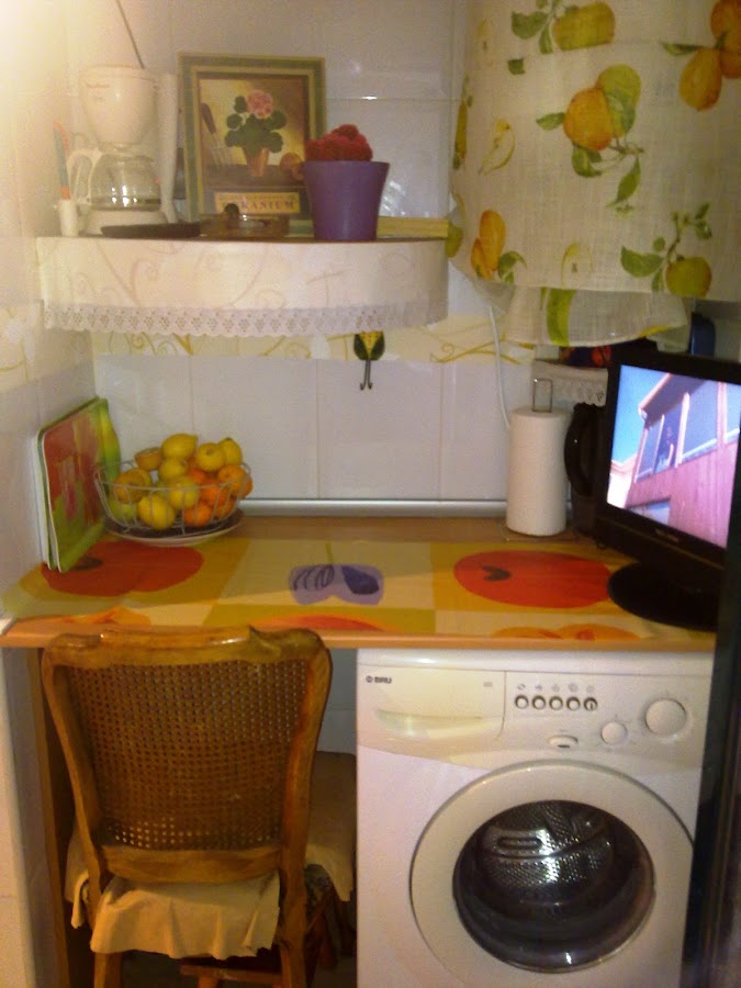 Zona de trabajo y desayuno. Totalmente modificada, silla antigua restaurada Antes era la zona de lavadora y secadora con armario escobero.