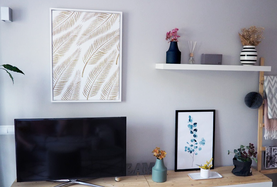 Para el salón he cogido un lienzo también inspirado en la naturaleza, con hojas de palma en dorado, el lienzo con marco blanco es tan espectacular que sé que le voy a dar mucho uso.