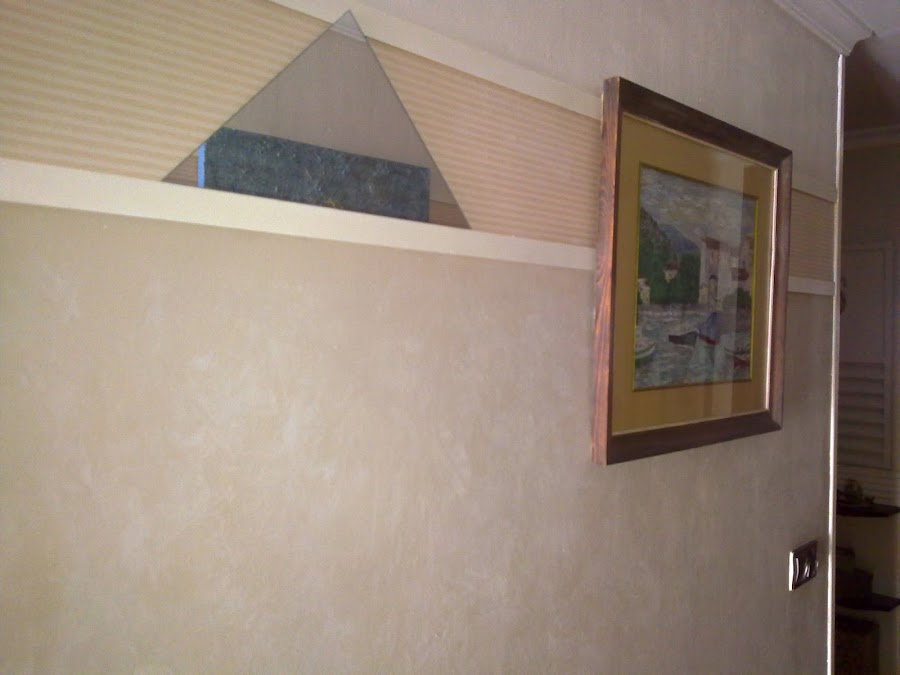 Aquí se aprecia mejor el papel de rayas y la moldura. Así como el drapeado que hice en la pared. Esta pintado en tonos beig y crudo.