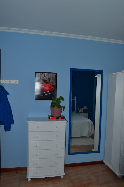 Cambiamos también el color de las paredes, utilizamos un azul claro en todas ellas, excepto en la del cabecero que utilizamos un azul más fuerte para crear profundidad.