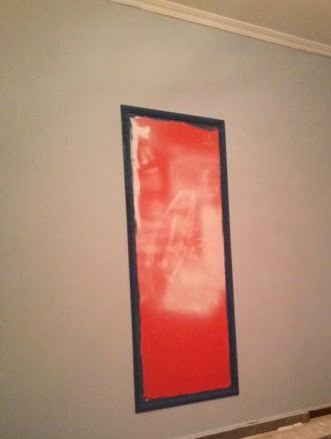 Colocamos un espejo a medida pegado a la misma pared, con un marco de yeso sencillo pintado en el color azul más oscuro.