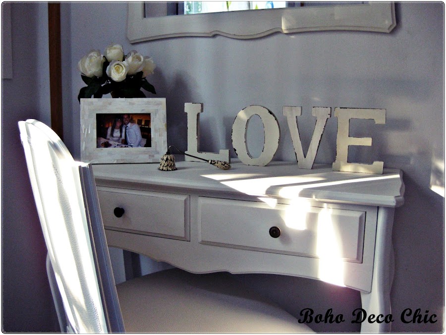 Para terminar la decoración se añadieron unas láminas de zapatos, las letras de madera decapada LOVE de http://happyideas.com/ y algunos detalles florales. De esta manera se creó un ambiente femenino y romántico.