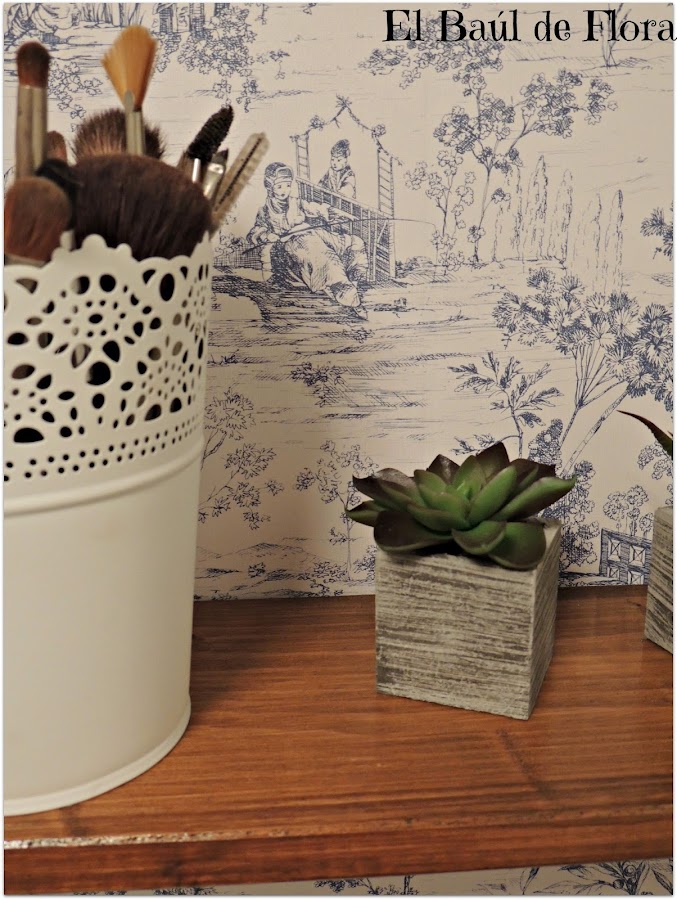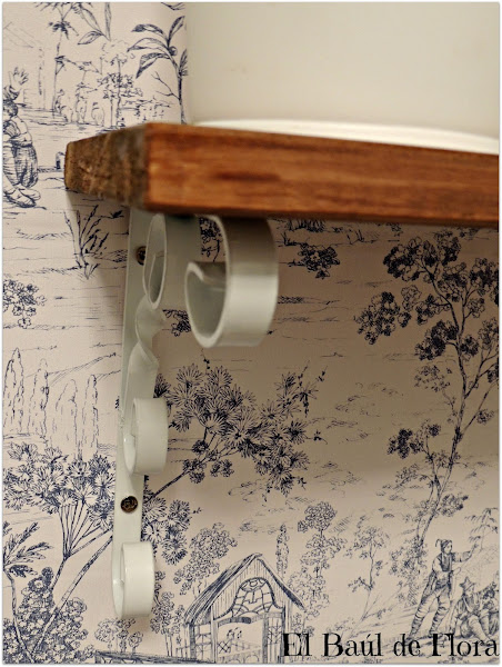 También coloqué papel en la pared detrás del wc. Además con unas maderas de pino que tenía guardadas, corté dos baldas que teñí y barnicé. En Leroy Merlin conseguí las escuadras metálicas blancas.
