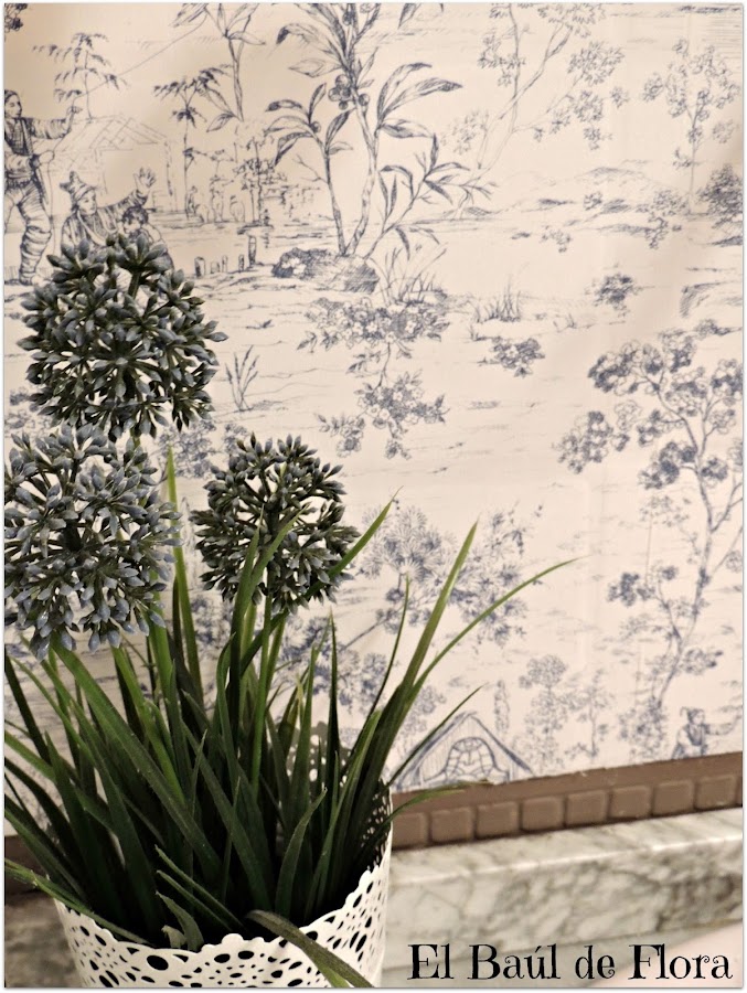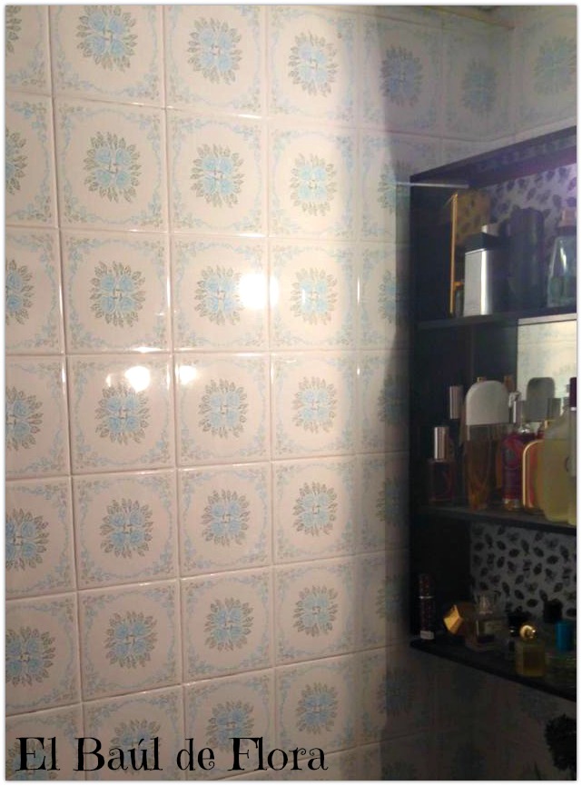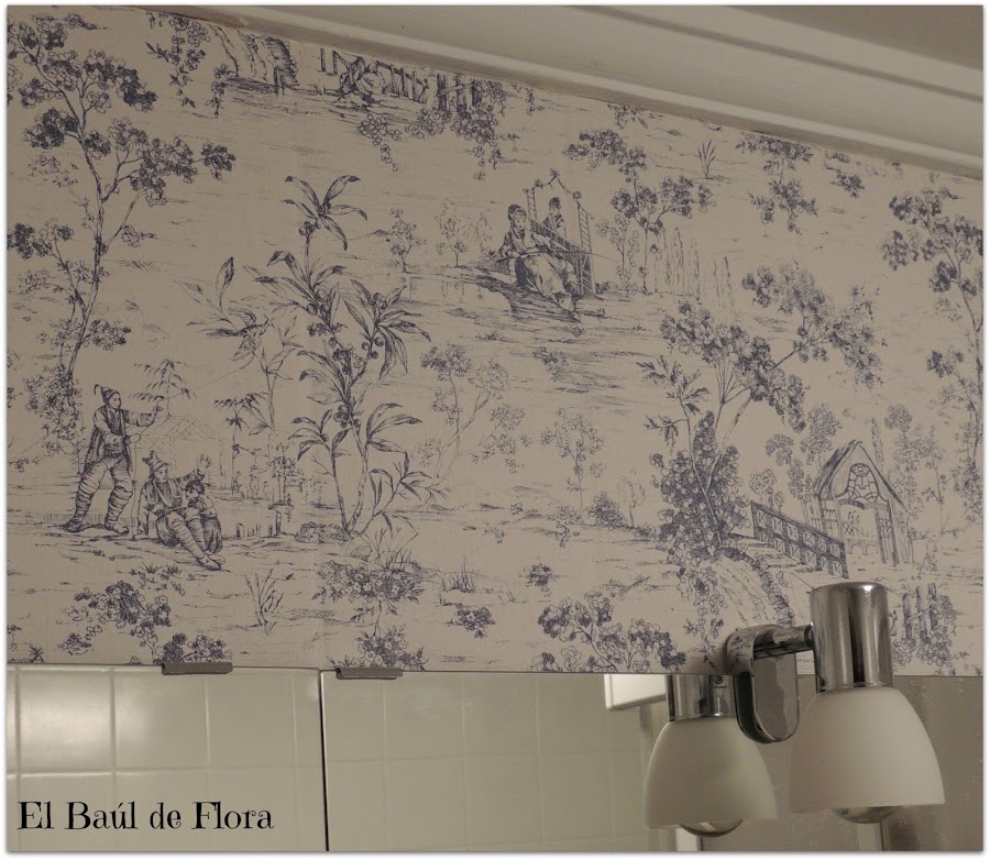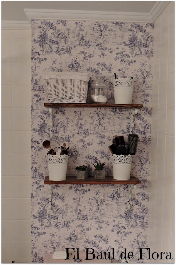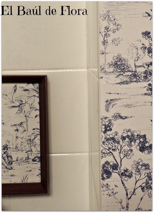 Los azulejos clásicos de los años 80 que teníamos casi todos en casa de nuestros padres y que a mi personalmente, me parecen los de la casa de la abuelita. Utilicé pintura blanca especial para azulejos para pintar todas las paredes y lo combiné con un papel de Toile de Jouy (así se llama a los estampados que representan escenas antiguas y que suele ser de un solo color) en color azul de Leroy Merlin. Para colocar el papel recurrí al manitas de casa en esos menesteres, mi marido.