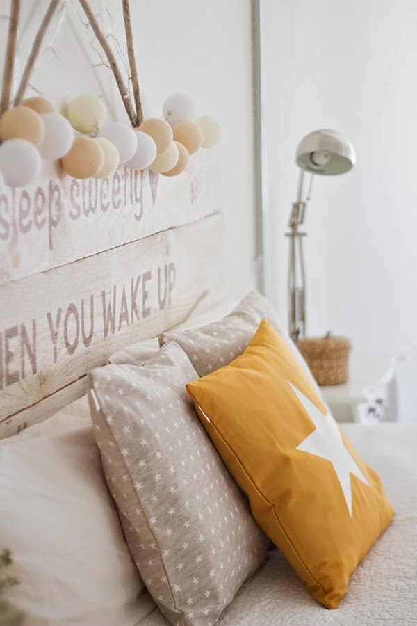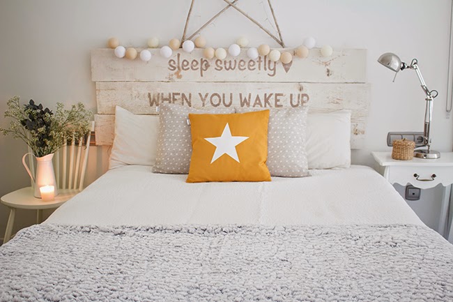 (Cabezal de Kenay Home, la manta de pelo y jarra blanca es de Maisons du Monde, colcha de Zara Home, cojín de estrella mostaza, cojines de estrellas arena y guirnalda de luces de Boho Deco Shop)