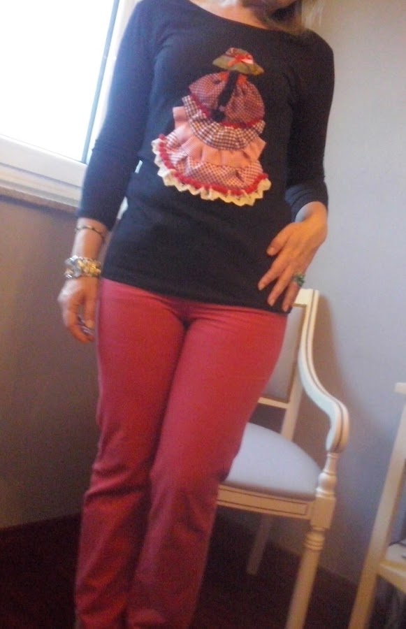 Lo prometido.....aquí estamos haciendo de modelo improvisada, con lo poco que me gusta posar, siempre dando "delete" a las fotos, je, je, pero todo ello para que podais ver esta camiseta que os había enseñado en el anterior post y las de veranito que ya las he recibido!!!