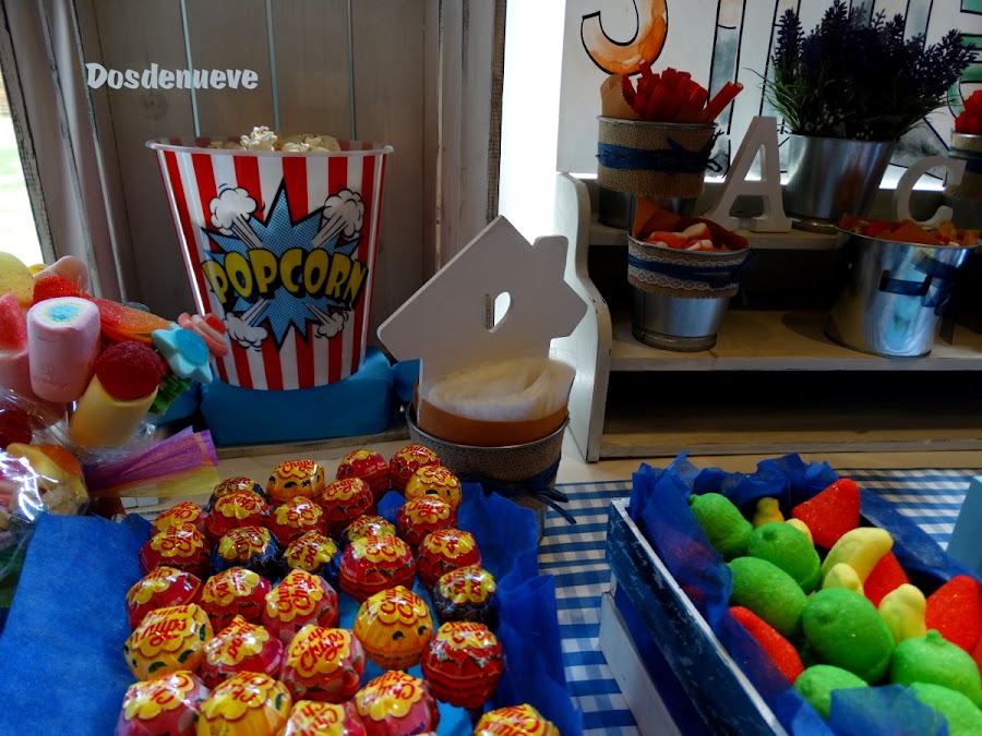 Para cerrar los laterales de la mesa hemos dispuesto en posición vertical dos cajas de fruta, también pintadas de blanco. Dentro de dichas cajas colocamos los botes de palomitas ( que puedes adquirir en cualquier bazar).