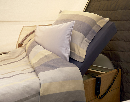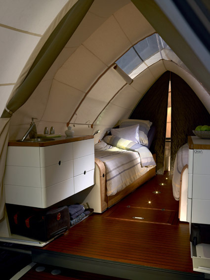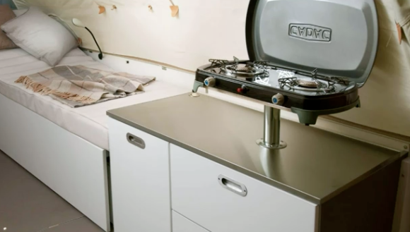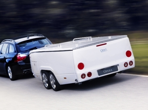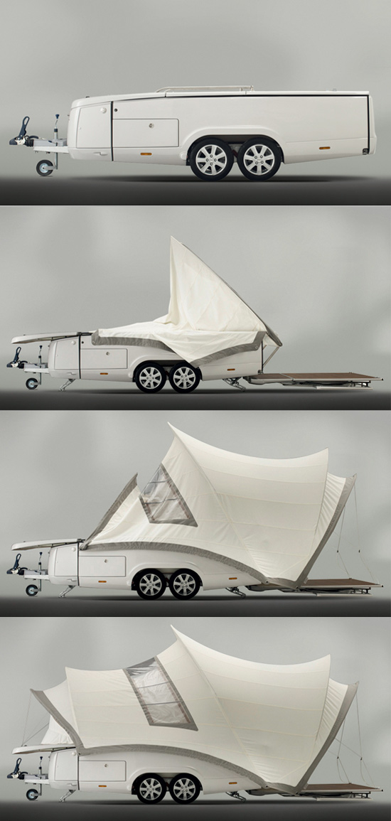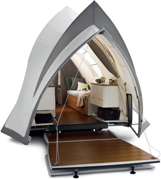 En tal solo cinco minutos y mediante el accionar de un control remoto, es posible desplegar las partes laterales, que no necesitan ningún apoyo adicional, pudiendo crear además una práctica terraza. En conjunto, cuando están todos los accesorios desplegados, su aspecto se asemeja a la famosa Casa de la Opéra de Sydney, de ahí su denominación.