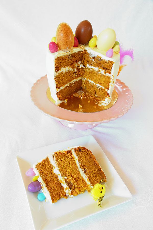 Los años anteriores me había decantado por las tradicionales monas de Pascua, un bizcocho genovés de yema o con ganaché de chocolate, incluso un año preparé un drip cake, pero este año me he decantado por una tarta más moderna y además creo que el carrot cake es una tarta ideal para Pascua, con eso de relacionar el conejo de pascua con la zanahoria.