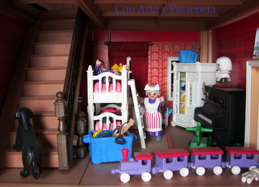 El cuarto de los niños tiene juguetes propios de los tiempos: trenecito, caballito , muñeca etc. Hay