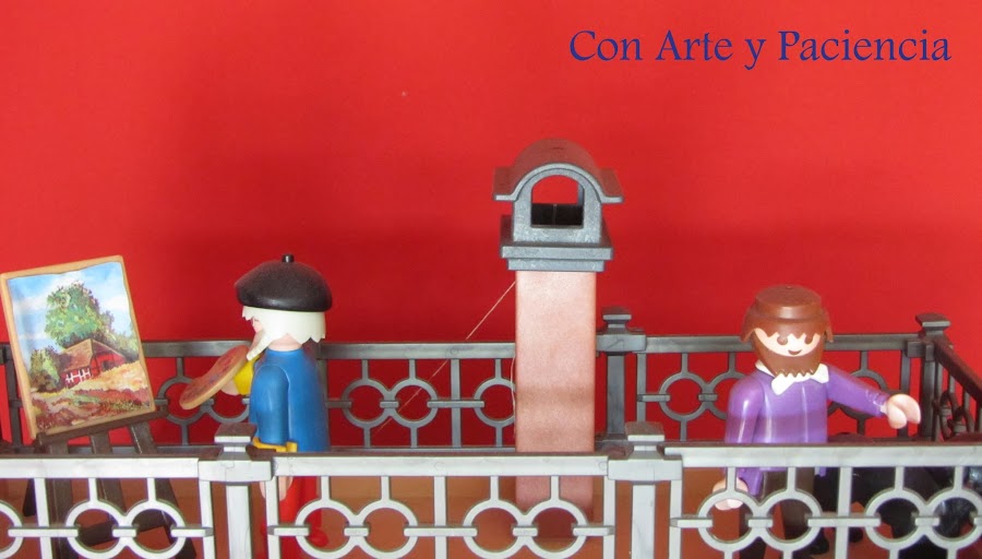 Fuera, tenemos la terraza para disfrutar del fresquito. con unos tiestos llenos de flores y una fachada muy propia de esta época. La sombrilla y hamaca no pertenecen a la colección pero para que descasen mis playmobils los he puesto:)