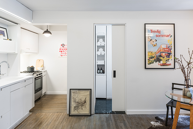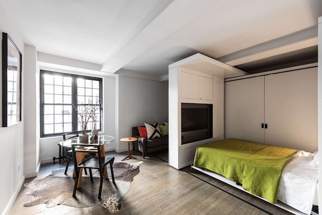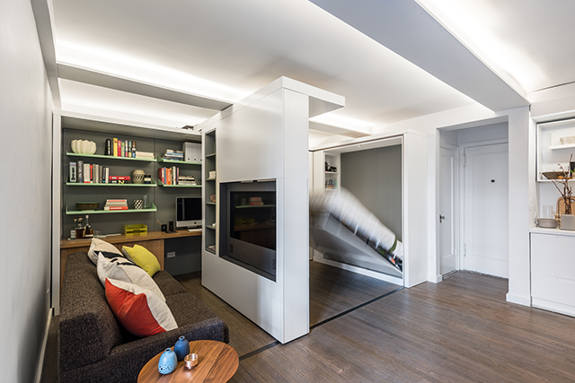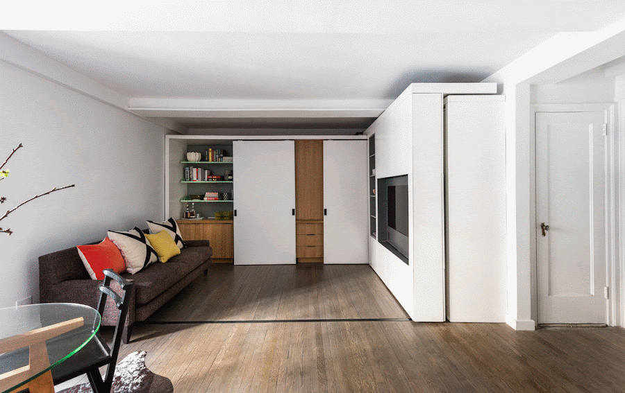 El estudio de arquitectura estadounidense MKCA ha conseguido que un "simple" muro corredero convertir un espacio único en varios. El muro a parte de separar, es un espacio de almacenamiento, con un espacio pivotante para la televisión. Y es que si lo pensamos bien, cuando estamos en el salón no estamos en la cama o al revés así que no encuentro ningún pero a este diseño, ¿y vosotros?