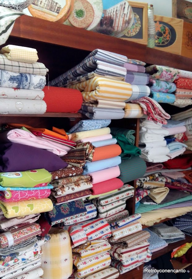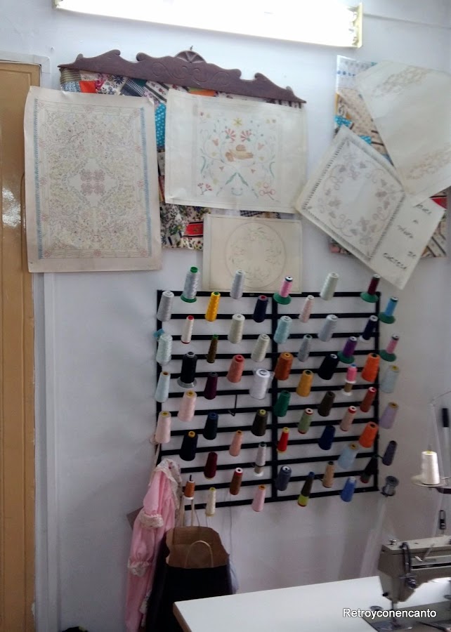 ..., copetes de madera sujentando telas y más patrones, decenas de colores en hilos para bordar, coser o tejer....
