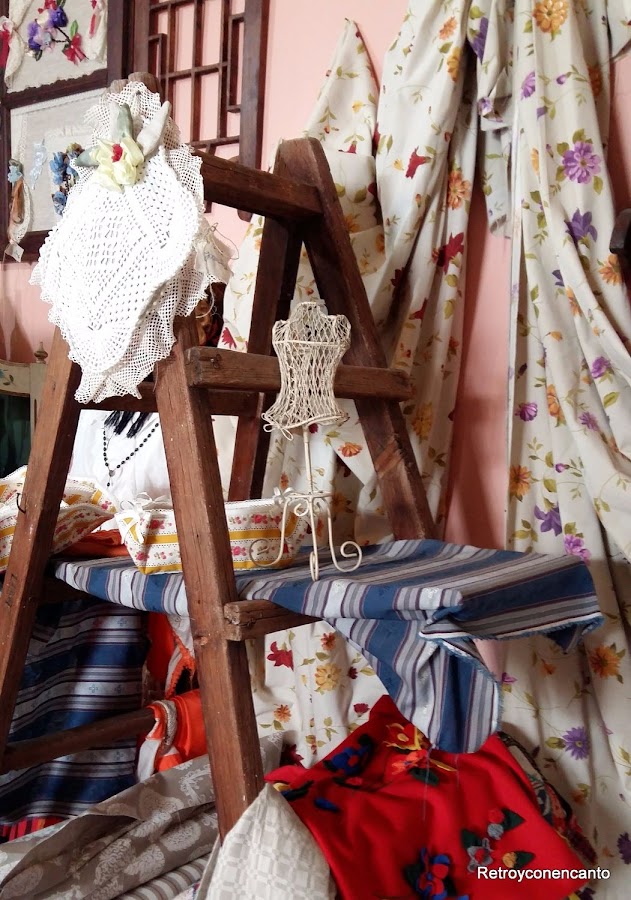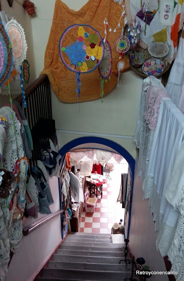 Las escaleras de acceso al piso superior estaban totalmente cubiertas de bordados, manteles, paños....