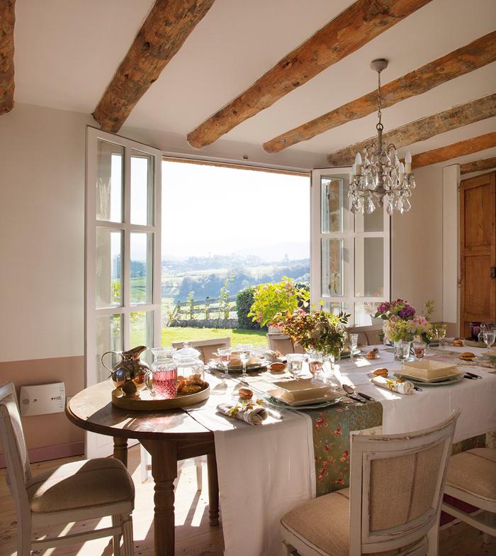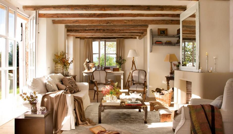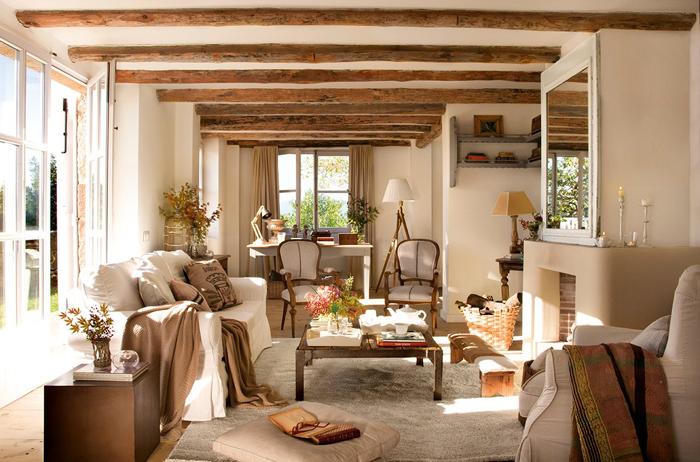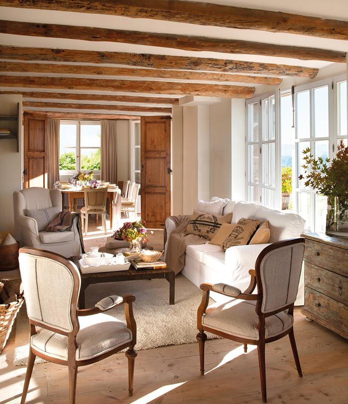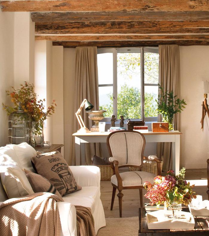 Posee una armonía y un toque de elegancia afrancesada, en ella se respira tranquilidad y la luz entra a raudales inundando cada rincón.La piedra y la madera ( vigas, suelos) están muy presentes en la contrucción. Blancas paredes sirven de lienzo a la decoración que esta basada en la mezcla de muebles de estilo rústico mezclados con otros más elegantes,la mayor parte de las piezas son restaurados y de origen francés ,otros han sido adquiridos en mercadillos de la zona.Una sabia elección de textiles,muchos linos naturales, lámparas y detalles conforman esta casa de campo que un dia resurgió de sus humildes orígenes como pajar para convertirse en una casa de una alegría serena que invita a relajare y disfrutar de la casa y su magnífico entorno.