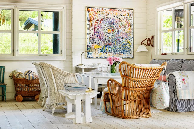 La influencia del estilo nórdico se palpa en el ambiente tanto por dentro como por fuera. Los muebles de mimbre, tejidos naturales, colores frescos y los muebles heredados, crean un ambiente encantador en esta pequeña casa de madera.