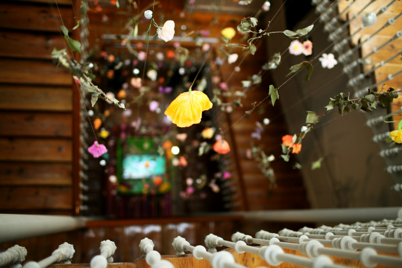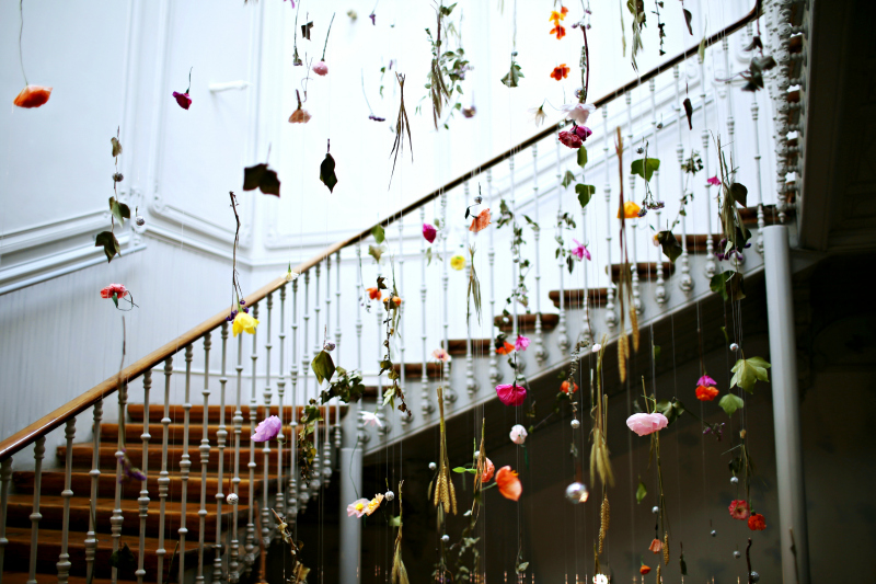 colgante de flores y hojas en el hueco de la maravillosa escalera: realmente