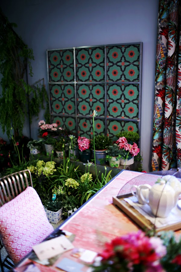 El comedor de verano lleno flores y estampados florales, así como la cocina