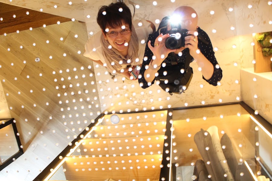 Momento divertido de selfi con Patricia, mi compañera de visita, en la ducha de la Suit Familiar Splendeur de Cristina Remírez de Ganuza y Jerome Le Fouillé.