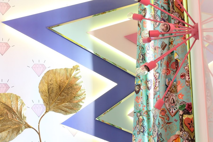Vestidor La Magia Del Color, de Miriam Alía Mateo un toque surrealista con una magia única, luz de neón, destellos de las lentejuelas y paredes forradas, sin duda una mezcla explosiva de luz y de color y a la vez femenino.
