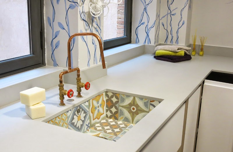 Y ahora vamos al turrón, ¡que tenéis que ver un montón de cosas, un montón de detalles bonitísimos, y también alguna idea diy...! ¿Qué os parece este grifo hecho con tubos de cobre y un pozo de azulejo hidráulico? Mi corazón empieza a latir...