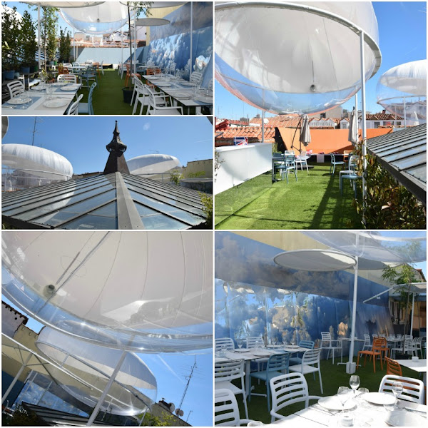 Ojo de Pez ha sorprendido por la instalación en la cubierta del edificio con sus "nubes" de TFT. Para copiar: la moqueta verde imitando césped, para todos los espacios exteriores, en contraste con el mobiliario blanco.