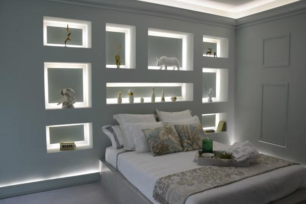 4 Design recrean un dormitorio, aseo y pequeño espacio de trabajo, que no me puede parecer más sofisticado... para copiar: las hornacinas de obra con leds escondidos, que dan esa sensación tan teatral.
