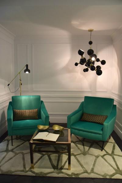 Miguel Muñoz, en su espacio de trabajo y aseos públicos, nos teletransporta a un Art Decó, actualizado, cálido y muy apetecible. Para copiar: esas butacas tapizadas verdes...amor a primera vista!