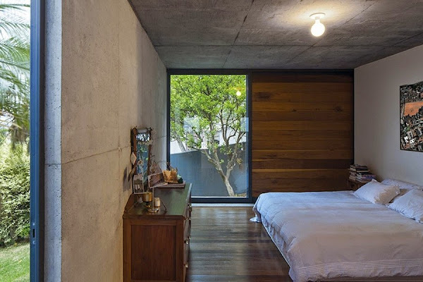 Los arquitectos explican además que el suelo se eleva 45 cm por encima de su nivel, permitiendo que el frente de la casa pueda ser utilizado como una cómoda zona de estar con vistas al jardín. Una escalera situada fuera de los principales interiores, permite un fácil acceso entre los pisos, sin la necesidad de ir dentro de la casa. Los muros de hormigón y suelos dan al lugar un ambiente sobrio y redirigen la atención hacia el paisaje fresco al aire libre. ¿Qué comentarios tienes sobre el diseño general de esta casa en Brasil? [Fotografía por Leonardo Finotti]