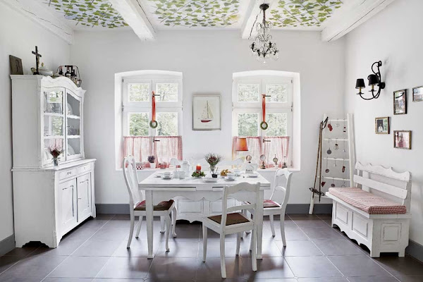 En cuánto a la zona de la cocina, lo que más me gusta es el contraste del gris con el blanco y la tela a cuadros roja, que también se encuentra en el banco del comedor. Fijaros en los dibujos del techo. Quedan geniales.