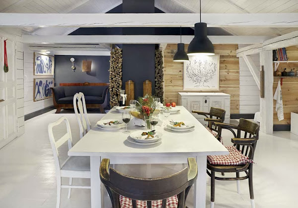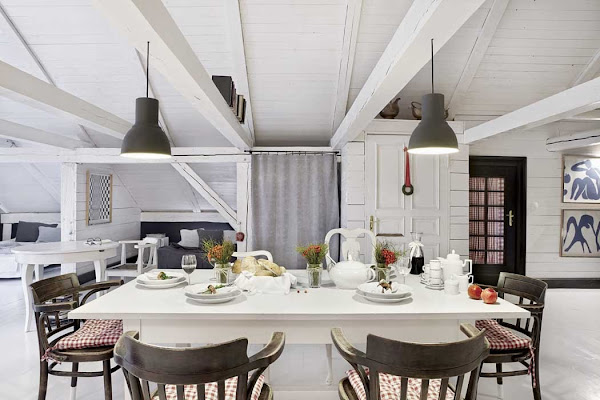 Seguimos con la zona de comedor dónde me encanta la pared de madera en color natural y los suelos blancos. Las vigas de color blanco son muy bonitas y en ellas vemos apoyadas a modo de estantes, unos libros. La mezcla de las sillas de madera oscuras y la mesa blanca quedan genial.