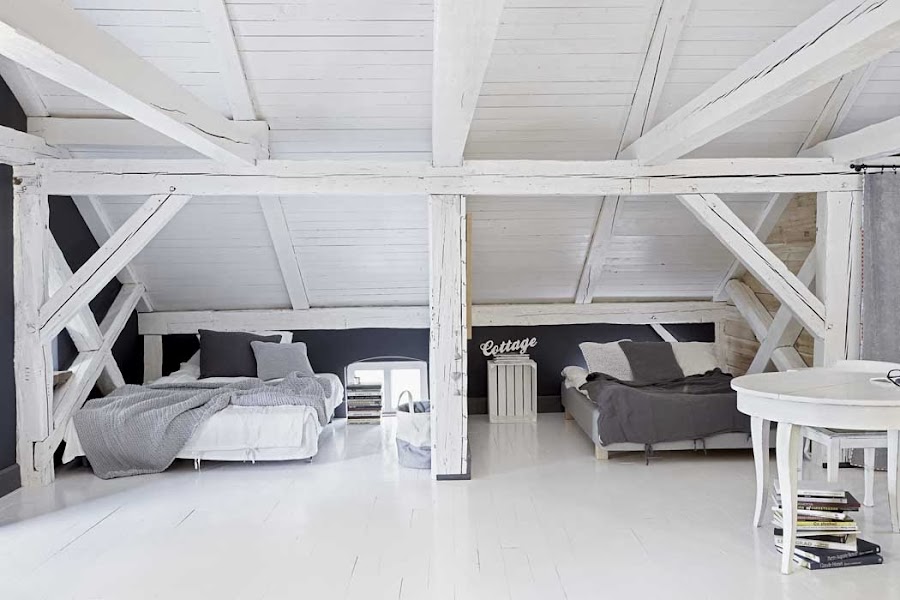 Vamos ahora con las zonas de descanso que están abiertas completamente al resto de la casa y que son muy acogedoras pues se encuentran en la zona abuhardillada del tejado. Me encanta el toque de los cojines de lana en una de las camas.