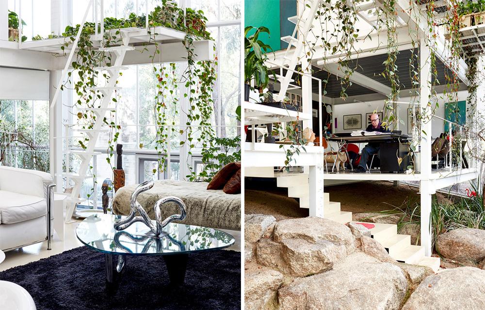 La naturaleza es una de las grandes protagonistas de la decoración, las plantas, helechos y árboles se encuentran tanto en el interior como en el exterior. Más aún, parte de la estructura ‘flota’ sobre la tierra y rocas originales que se han dejado a la vista y han pasado a formar parte del interiorismo. El juego de desniveles con los distintos altillos que componen las estancias del hogar completamente abierto, hacen que esta casa sea totalmente orgánica.