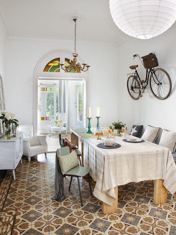 Un hogar al que no le falta detalle ni rincón por decorar: Una bici clásica con cesta de mimbre colgada en la pared es uno de los elementos que decoran esta casa que más me llaman la atención, pero no es el único, ya que si una de las cosas que tiene esta casa es su combinación de elementos clásicos con modernos como las lámparas y decoración IKEA que podemos ver en la cocina, dormitorios y salón comedor.