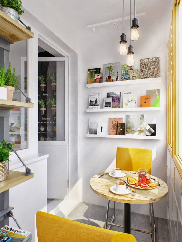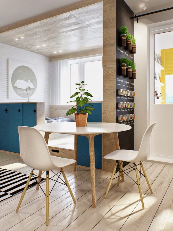 Como os contaba, es un estudio, pensada para dos personas, donde podemos encontrar una zona de relax, con su sofá y televisión, un mesa para comer con su pequeña cocina, y un ambiente separado por una pequeña elevación que han hecho, para diferenciar ambientes y para crear más espacio para almacenaje, han puesto una cama con una pequeña zona de trabajo. Y todo esto sin olvidar la mini terraza que han conseguido...vamos que me tiene loca este proyecto.