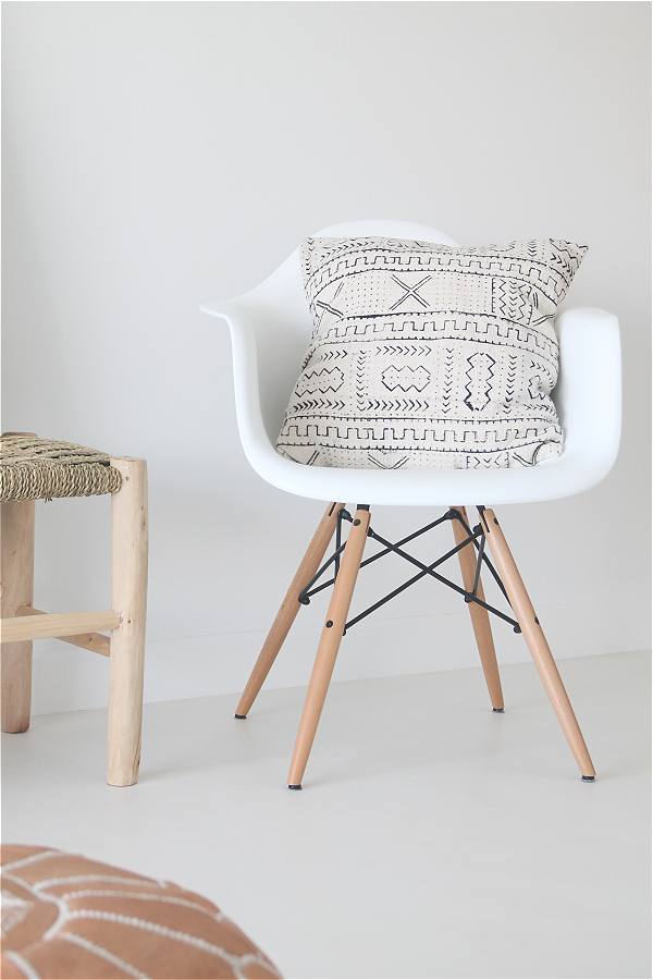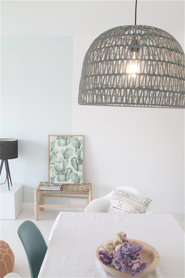 En la zona de comedor, por el momento, estamos incluyendo nuevas piezas como la lámpara sobre la mesa, un banquito marroquí y sillas tipo "eames". Estas últimas aportan el toque nórdico que necesitamos y aunque ya tuvimos este modelo antes hemos preferido renovarlas y apostar por una silla de color verde abeto para que se integre con la paleta de color del salón.