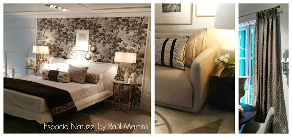 Y de una cocina, nos vamos a nada menos que a un dúplex, el que ocupaba el "Espacio Natuzzi Loft by Raúl Martins". Compuesto por un dormitorio en la parte superior y un salón-comedor en la inferior, el resultado de la mezcla de mobiliario de diseño, antigüedades y obras de arte, es un espacio ecléctico pero con mucha clase. Por destacar un detalle, me encantaron los cortinones del comedor realizados con el tejido "Hexagonal" de Le Creations de la Maison, una referencia que tenemos disponible aquí en la tienda y que estoy deseando utilizar.